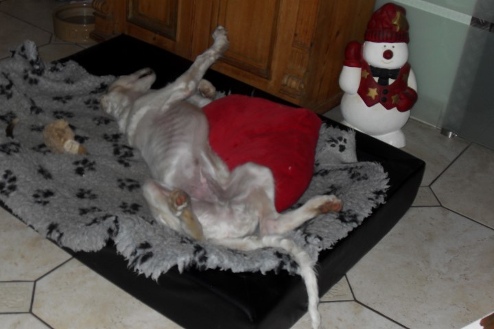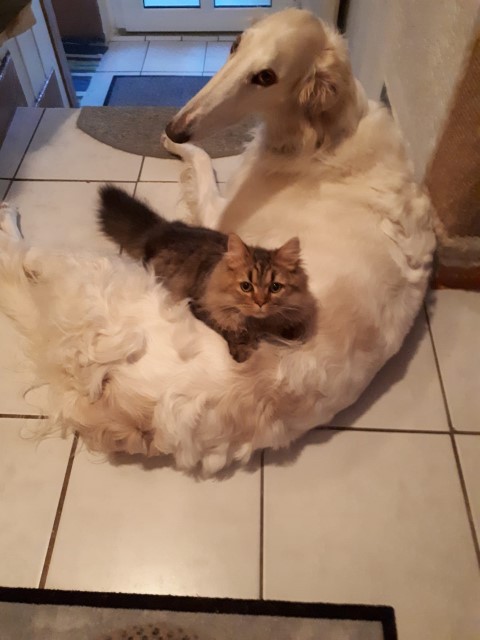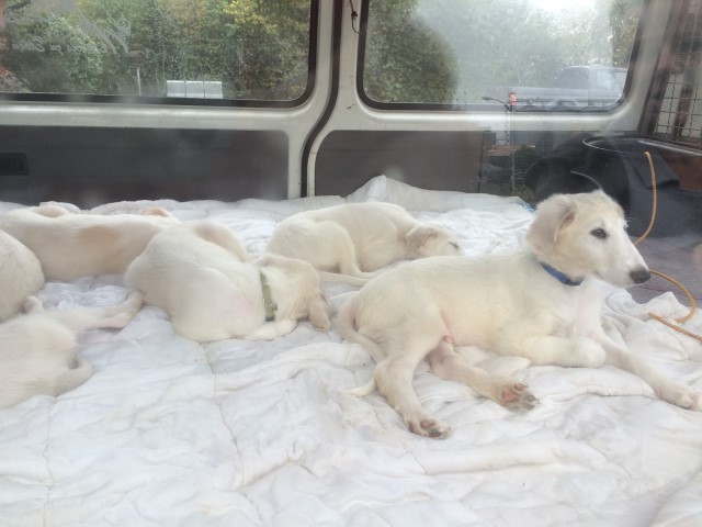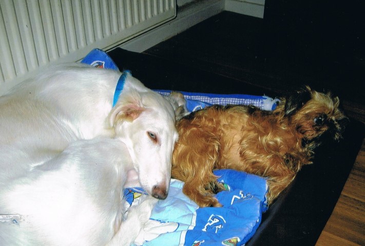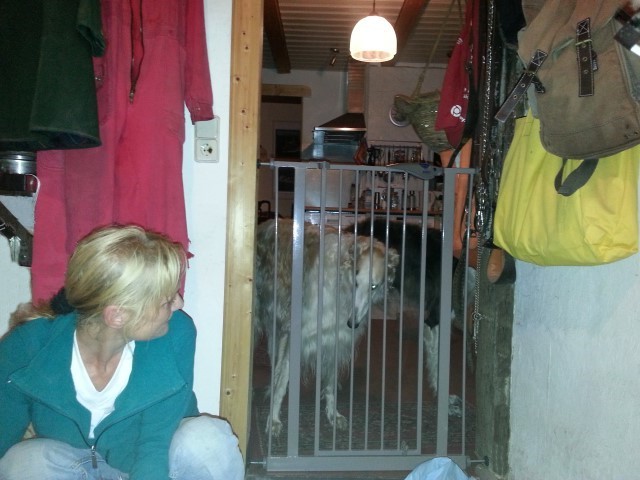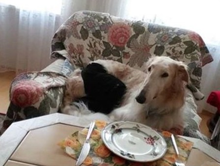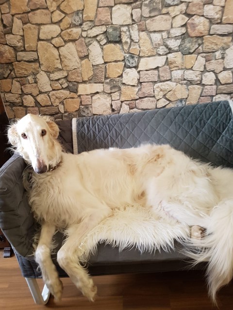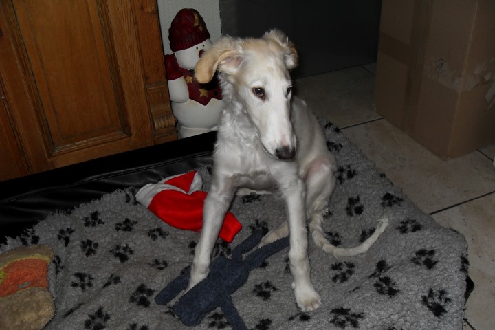 Zu Hause hat er erst alles inspiziert, dann ordentlich gefuttert, mit seiner neuen Menschen-und Barsoifamilie einen Pipi-Spaziergang gemacht und ist danach zufrieden ins Bett gegangen.