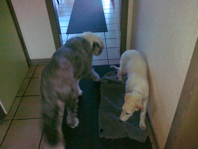 Nach dem ausgibigem Spielen und Rennen über die verschneiten Felder, geht es wieder Heim. Da wartet schon eine "Erfrischung" auf die beiden Freunde und anschließend ein Leckerli! Wie schön ist es doch zu Hause!