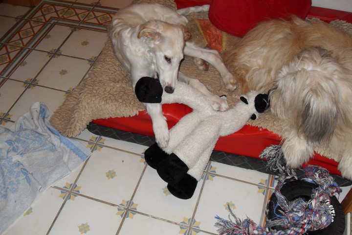 Spielen mit Mama und Opal: ![]() Das eigentliche "Welpengehege" wird schnell nicht mehr gebraucht und das Tor zum großen Gehege steht auf. Die Kleinen genießen es, im Sandkasten zu buddeln und zu graben! Vor ihnen war nichts sicher, der Gartenschlauch wurde zerfetzt und man übte sich daran an "Seilziehen". Alles Mögliche an "Beute" ( Handfeger, Tüten, Schuhe etc ) wird heimlich mitgenommen und oft sieht das Gehege aus wie eine Mülldeponie oder wie ein Truppenübungsplatz! Ihnen macht es Spaß, mir Arbeit, doch eine schönere Kinderzeit kann es für die Welpen gar nicht geben: Ganz "Hund" sein, viel Blödsinn machen, ausgelassen spielen und toben, genau das lieben unsere "Großen" ja auch. 15.11.2014: Aquamarin zu elben Äiken 20.11.2014: Achat, inzwischen 12 KG schwer, wird ein richtig großer Hund, Amethyst Arkadij ist etwas feiner, aber auch schon ein "Brocken" von 10 KG, und groß genug wird er auch. Die Welpen in ihrem neuen Zuhause: Asja 08.11.2014: Heute wurde Asja abgeholt. Sie bleibt als einzige in unserer Nähe und hat sich auch schon mit Lea Raschi-Pack-Buran angefreundet. Zuerst fand Lea sie völlig überflüssig, doch das hat sich inzwischen schnell geändert und Asja schaut sich viel von Lea ab und lernt spielerisch alles Wichtige für ihr Leben.