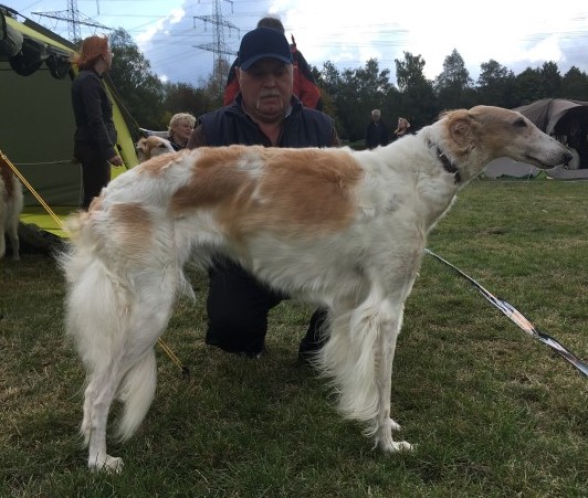 Opal Raschi-Pack-Buran, 20.07.2013, B18481Prädikatskörung für Schönheit & Leistung, Dt. Champion VDH, Dt. Champion DWZRV, Dt. Champion Schönheit & Leistung, DWZRV-Coursing-Champion, DWZRV-Sieger Schönheit & Leistung 17, DWZRV-Sieger Schönheit &Leistung 2017, Leistungs Urkunde-Coursing, CACIL-Prüfung, Dt. Jgd-Ch. VDH, Dt. Jgd-Ch. DWZRV, Frühjahrsjugendsieger Dortmund 2014, LJS NRW 2014 Wellhaar, rot, d. gestromter Mantel, DM-heterocygot Buyana, 12.06.2012 ( Diplomierte russische Jagdhündin, DM-Status: N/N )Wellhaar, weiß mit roten ( cremefarbenen ) Platten.