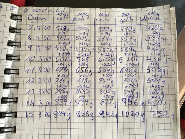 Die "7 Zwerge" ![]() Am 07. und 8.01.2020 deckte Opal seine Buyana. Der darauf hin errechneter Geburtstermin war der 07. oder 08. März. Und pünktlich, wie eine Schweizer Uhr war es an diesem Wochenende auf so weit: Die Wehen setzten um 18:41 h ein, um 21:34 h erblickte die erste Hündin das Licht der Welt. Fast auf die Minute pünktlich folgten im Abstand von einer Stunde noch drei weitere Hündinnen. Inzwischen war es 01:29 h am Sonntag. Um 06:30 h kam dann noch ein kleiner Rüde, am Nachmittag um 16:00 h der zweite und später, am Abend um 19: 57 h der letzte Rüde. Wir standen seit Nachmittag in ständigem Kontakt mit der Klinik, da sich die Geburt des letzten Welpen so sehr herauszögerte. Und gerade, als ich das Auto vorgefahren hatte, um dort hin zu fahren, kam der kleine "Scheißer" doch noch auf natürlichem Wege zur Welt. Alle Welpen waren wohl auf, auch wenn ihr Start ins Leben wie ein Abenteuer anmutet. Mutter Buyana hat ausreichend Milch und die Welpen großen Durst. So haben wir Samstags- und Sonntagskinder, aber alle sind Wunschkinder! In dieser Reihenfolge kamen sie auch auf die Welt: Die 4 Mädchen: Die "Opaline" in rot und "Pünkchen" in pink, die "Odaline" in rosa und die "Maxine" in gelb. Die 3 Jungs: der "Bundesbahn" in dunkelblau ( DB ) und "Kleinhund" in grau und last but not least: " Fadenkreuz" in hellblau: Natürlich sind das nicht ihre richtigen Namen, sondern ihre vorläufigen "Arbeitstitel"! Die Namen sind schon fix, aber hier nicht in der Reihenfolge, wie die Welpen liegen: Bella Mala, Bellissima Contessa, Bat Whispers Baryt, B-Knjaginja Morosova und die Rüden werden Beryll, Bordeaux und B-Knjas Morosow heißen. _________________________ Die Gewichteder Welpen und die Fieberkurve von Mama: Weiter wird zwar gemessen, aber alles ist bislang im "grünen Bereich"! _________________________ Die 2. Woche: Sonntag, den 22.03.2020: Alle haben die Äuglein auf und werden sehr aktiv. Sie haben alle ein sehr intensives Pigment und werden im Farbspiegel dem Papa ähnlich. _________________________ _________________________ Leider hat mir Frau Jana Labahn mir untersagt, die Fotos, die sie mit ihrer Kamera aufgenommen hat, weiterhin zu veröffentlichen. _________________________ _________________________ _________________________ Die 8. Woche: |