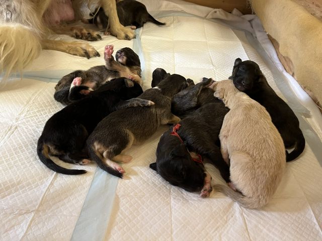 ![]() Champagner, Eylin und Eldarit. 22.10.2025: Heute sind die 8 Racker 5 Tage alt. Es war gar nicht so einfach, sie auf Bilder fest zu halten. Schon in dem "Alter" hatten sie es ganz schön eilig, wieder zu Mama Nitro zu kommen! Grünes Halsband: Eylin ( fest vergeben ) Hündin in Blau, ganz süß, mit weißer Schwanzspitze Hündin in Rosa, ein schönes Kleinod ![]() Hündin Elba, die Dame mit der Maske! Sie ist so bezaubernd _____________ Und jetzt die 4 Jungs: Der Rüde mit dem roten Halsband Eldarit ( reserviert ) Die braune "Haselnuß" der champagnerfarbene Rüde ( reserviert ) der Schöne mit der schwarzen Seele |