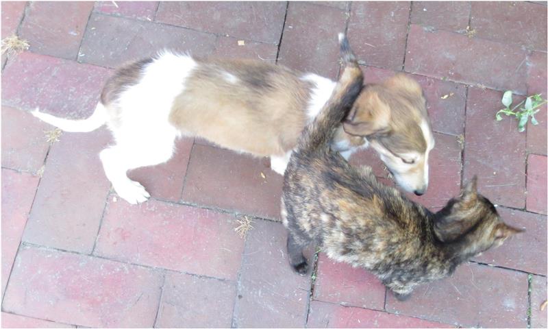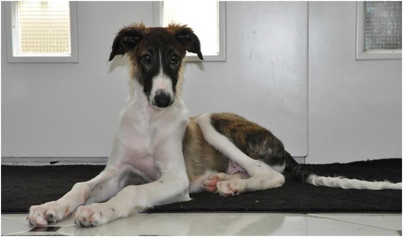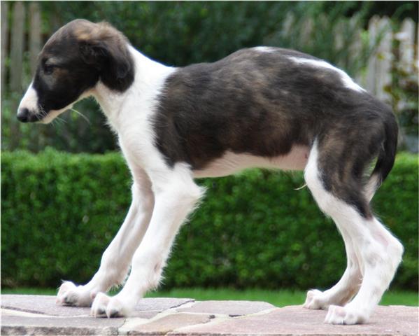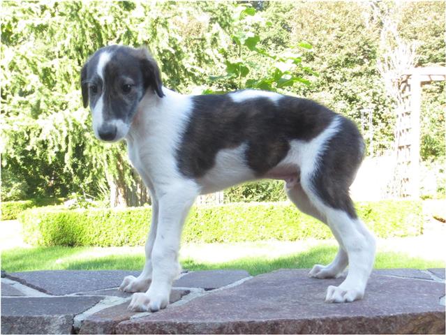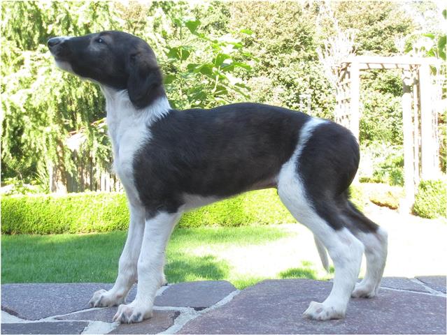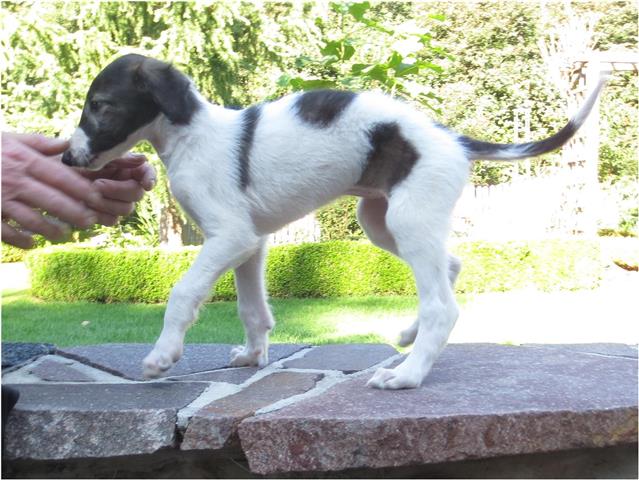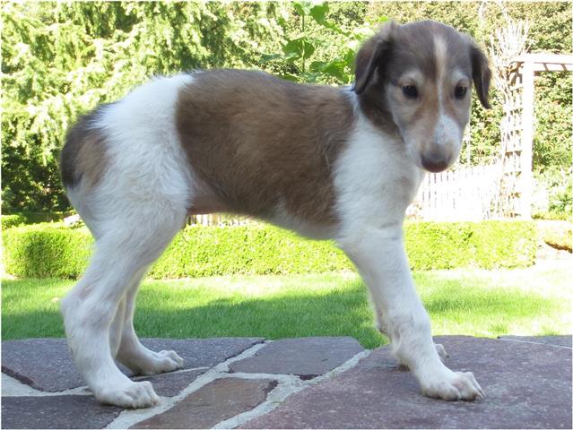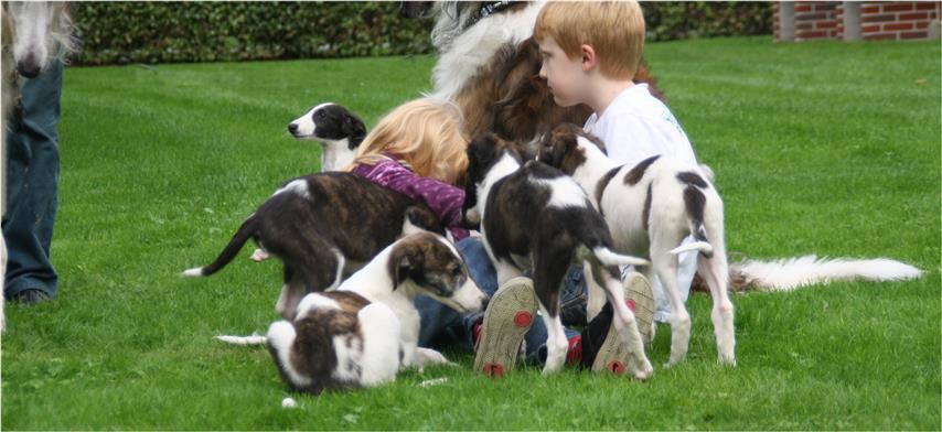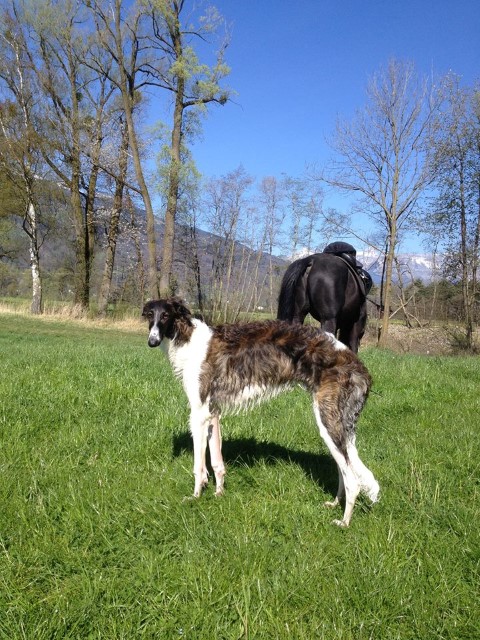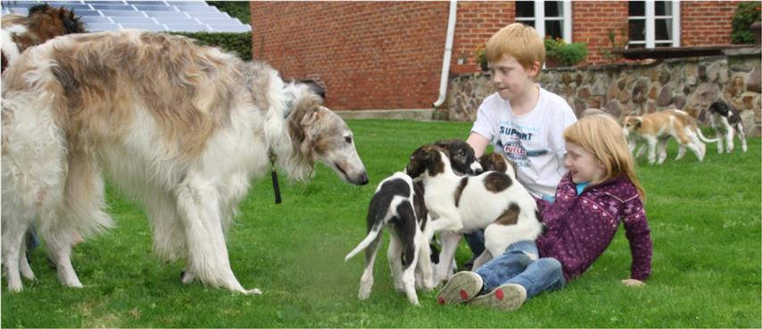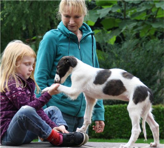 Am 20.07.2013 wurden 9 süße Welpen geboren: 6 kleine Rüden und 3 Mädchen. Das hier sind die beiden ersten! 25.07.2013: Die Pigmentierung setzt ein. Orlik und Odaloiy, Otvaya und Opal. 08.08.2013: Die 3 Mädchen sehen sich fast zum Verwechseln ähnlich! Die dunklen 4 Rüden: Odaloij, Ochotnik, Opal und Otvaya. Die beiden Roten: Oleg und Orlik. 14.08.2013: Odaloij auf Achims Arm, er sollte zu uns kommen. 06.09.2013: Olessia Olala Olya Die Dritte im Bunde: Oblonka Jetzt die kleinen Rüden: Opal Odaloij Otvaya Ochotnik Orlik Oleg 25.09.2013: Spielen im Garten mit Hubi und Merete. Sie lernen alles kennen, auch Katzen. Onkel Maxim und Onkel Nabat begrüßen ihre Nichten und Neffen. Auf einem Pferdezuchthof gibt es immer viel zu tun, und nicht alles kann man auf einmal schaffen. Da jetzt wieder öfter Welpen hier zur Welt kommen sollen, wird das Hundegehege komplett aufgearbeitet: Es wird umgepflügt, Bäumchen werden gepflanzt und neuer Rasen wird eingesät. Natürlich muß sich das alles erst richtig wieder festigen und anwachsen, so haben die Barsois erst einmal ein kleineres, provisorisches Gehege. Doch alles liegt bereit, die große Auslauffläche wieder frei zu geben. 27.09.2013: Fotoshooting: Oblonka, Olessia, Metete und ich mit Olala Oleg und Orlik Odaloij und Opal Have a brake, have a kitkat: Schmusen mit der Katze! Sie lernen fast alle Tiere kennen, die auf einem Bauernhof leben. Das Leben in der neuen Familie: Otvaya: Otvaya hat ein wunderschönes Zuhause in Liechtenstein gefunden. Hin und wieder treffe ich ihn auf Ausstellungen. Auch von ihm bekomme ich regelmäßig Fotos und erfahre, wie es ihm geht. Erste Bilder von Otvaya zu Hause in Liechtenstein.