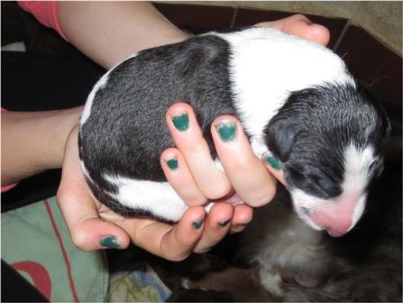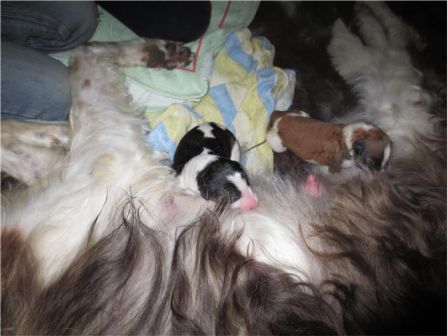 Neweßta , noch naß von der von der Geburt, doch wenn sie sich etwas erholt hat, kommt die "Reinigungskolonne"! Keiner soll glauben, Neweßta liege mit ihren Kindern auf einer dünnen Matte auf kalten Fliesen! Nein, im Gegenteil: Eine konfortable Bodenheizung regelt in den verschiedenen Liegezonen die Temperatur, so daß für Mutter und individuell für die Welpen angenehme Liegetemperaturen herrschen. Kaum, wenn nicht gar kein anderer Kennel bietet seinen Hunden diesen Luxus. Man kann es mit einer warmen Kachelofenbank vergleichen und es trocknet die Haut der Welpen nicht aus, wie bei einer Wärmelampe. Zudem sind diese Hundplätze sehr gut hygienisch sauber zu halten.