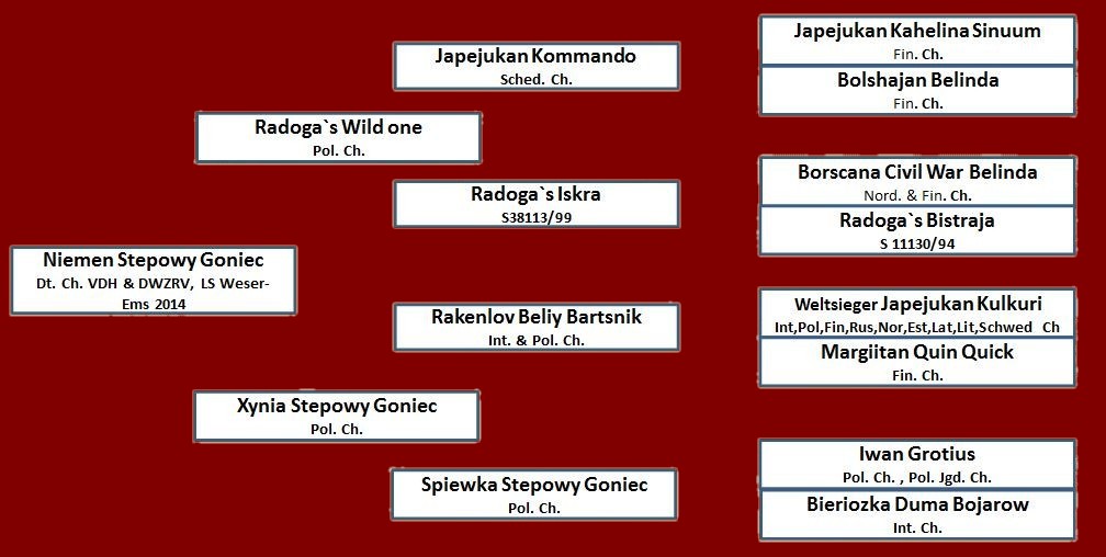 Dt. Ch. VDH, Dt. Ch. DWZRV, LS Weser-Ems 2014, LS Niedersachsen-Sachsen-Anhalt 2015 Niemen Stepowy Goniec & Bohdana vom Falknerforst Der Vater Niemen ist einer der erfolgreichsten Ausstellungshunde des Dt. Windhundzucht-u. Rennverbands ( DWZRV ) in 2013 und 2014.