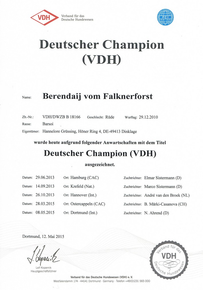 Richterin: Frau Ahrend, D Amethyst: in der Jüngstenklasse: VVSP1, Jüngsten-BOB, Opal: Zwischenklasse: V1, VDH, Res-CAC, Res-CACIB, Berendaij: offene Klasse: V1, VDH, CAC, BR, CACIB, BOS, Frühjahrssieger Dortmund 2015