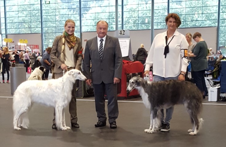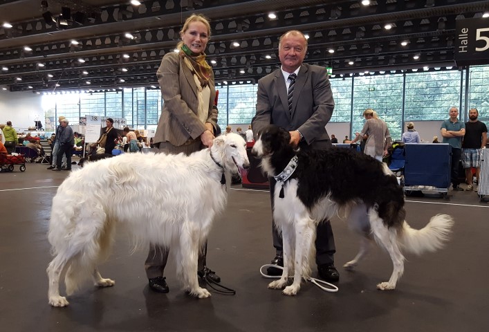 Bremen, 30.07.2016 Richterin: Carolin van Zanten, Nl Pauli: Zwischenklasse: SG 1, Amethyst: Offene Klasse: SG 2, High: Veteranenklasse: Platz 2, Res-VDH & CAC ![]() ![]() ![]() Bremen, 31.07.2016 Richter: Louis Dehaes, BE Pauli: Zwischenklasse: V1, VDH, Res.-CAC => CAC Amethyst: Offene Klasse: V1, VDH, CAC, BR, BOS, High: Veteranenklasse: Platz 2, Res-VDH & CAC ![]() ![]() Amethyst und Paul, ein zufriedenes Frauchen und ein lächelnder Richter! ![]() High |