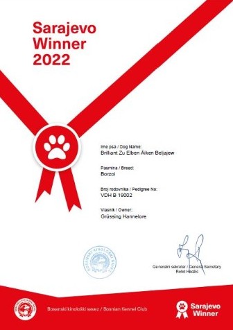 Sarajevo, CAC, CACIB, 17.12.2022 Richter: / Oliver Simon/HR Richter: Hans Almgren/SE Brilliant in der Championklasse: V 1, CAC, Bester Rüde, BOB, Sarajevo-Winner Brilliant in der Championklasse: V 1, CACIB, CAC, Bester Rüde, BOB, |